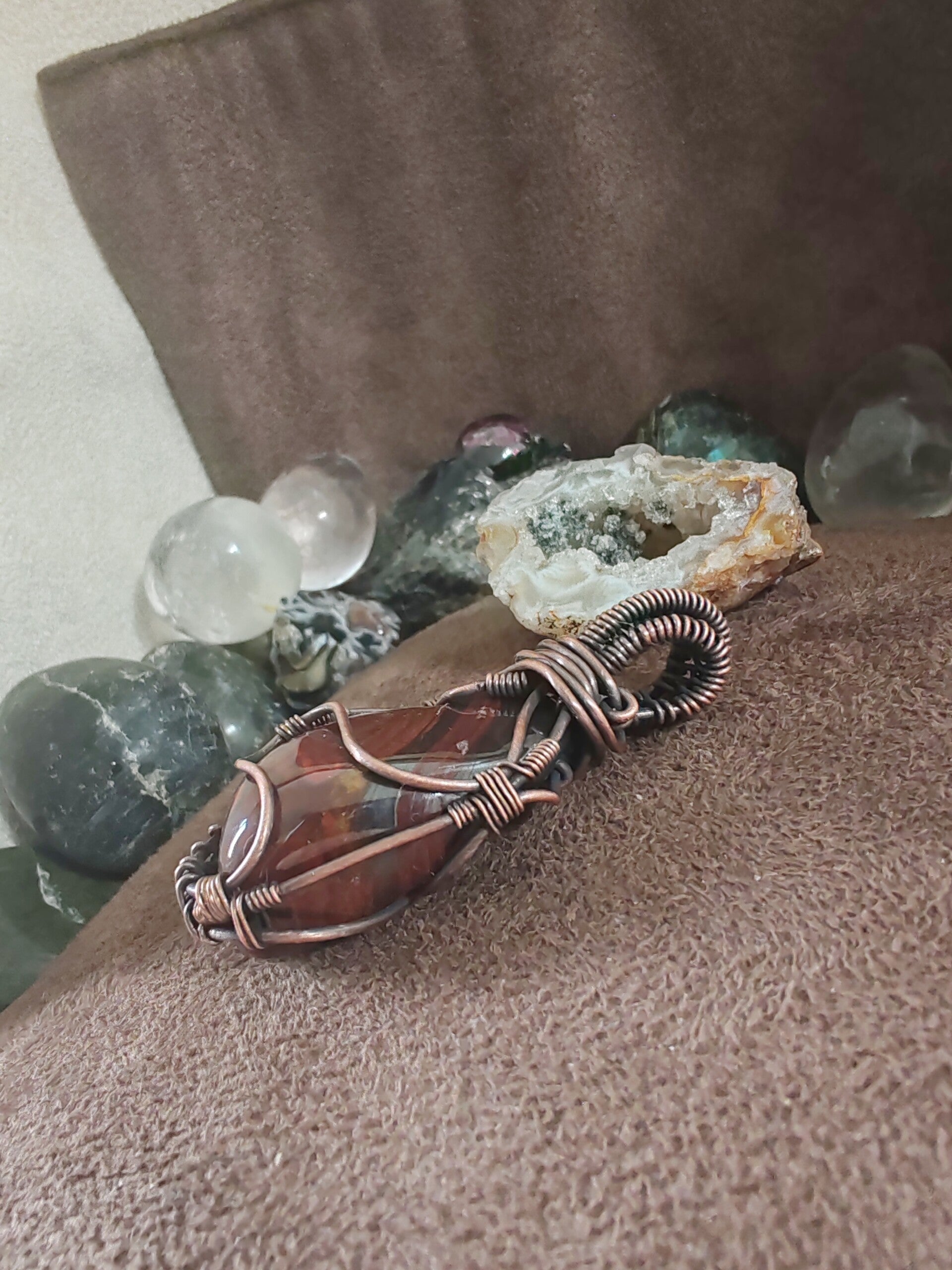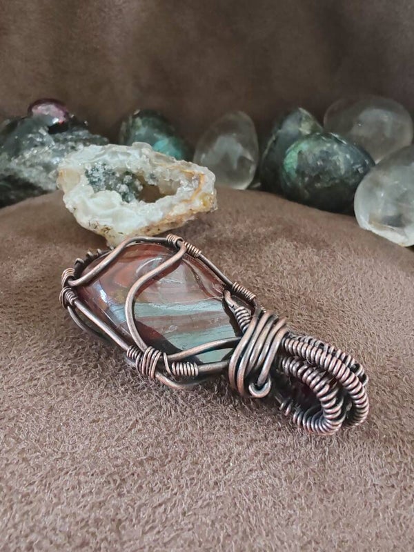 J'utilise du fil de cuivre, teinté ou non, traité antioxydant ou non, de laiton et d'aluminium. Avec le temps, ces matériaux s'oxydent, et patinent le bijoux. Certains aiment et d'autres pas, il est possible de les nettoyer avec de la laine d'acier 0000 et de l'eau savonneuse, afin de leur rendre leur brillance d'origine. Pour limiter l'oxydation, je vous recommande de ne pas prendre de douche avec votre bijoux, d'éviter de le mouiller. Pour certaines pierres, les variations de températures sont déconseillées et risqueraient de les endommager à long terme.