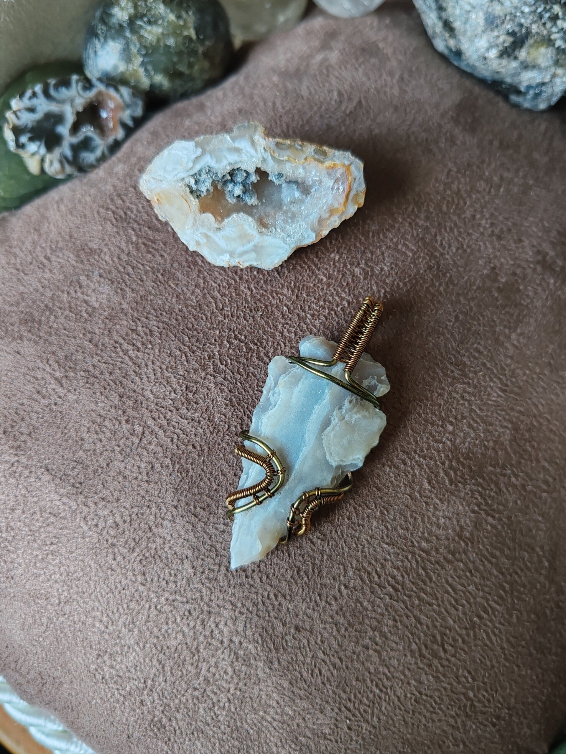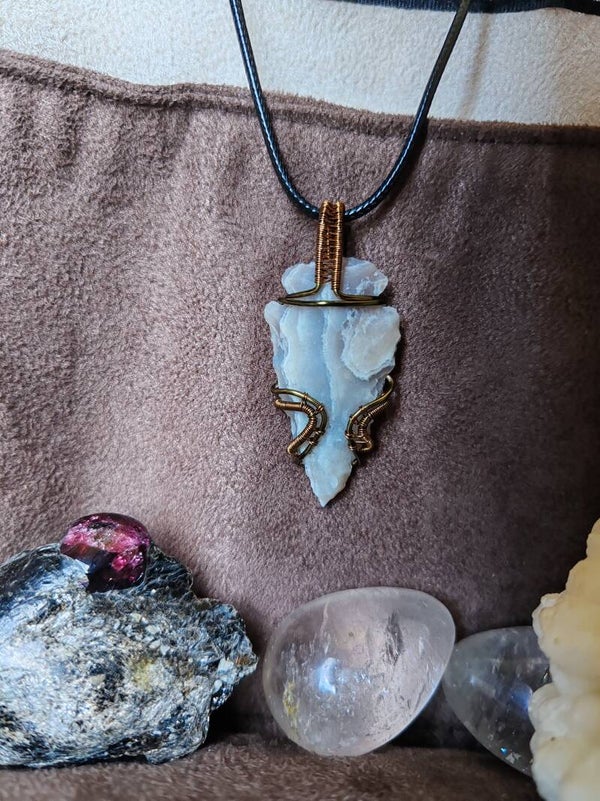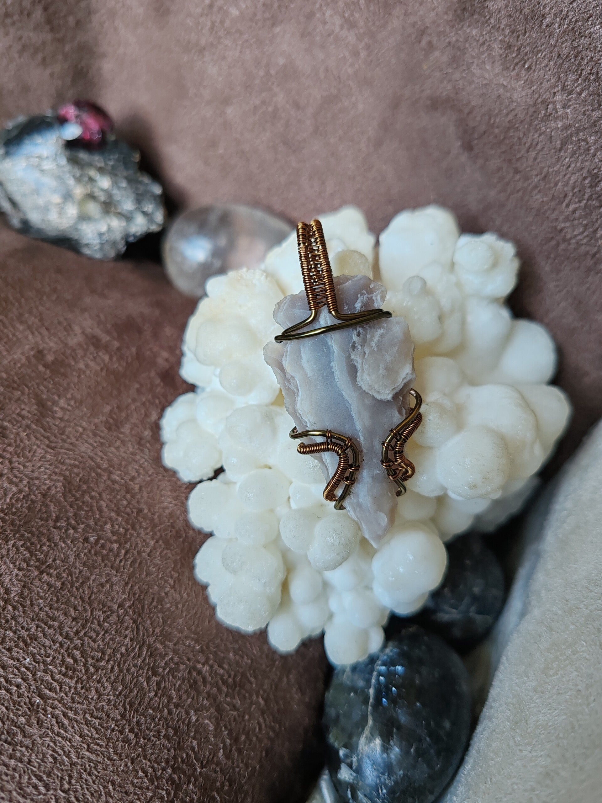 J'utilise du fil de cuivre, teinté ou non, traité antioxydant ou non, de laiton et d'aluminium. Avec le temps, ces matériaux s'oxydent, et patinent le bijoux. Certains aiment et d'autres pas, il est possible de les nettoyer avec de la laine d'acier 0000 et de l'eau savonneuse, afin de leur rendre leur brillance d'origine. Pour limiter l'oxydation, je vous recommande de ne pas prendre de douche avec votre bijoux, d'éviter de le mouiller. Pour certaines pierres, les variations de températures sont déconseillées et risqueraient de les endommager à long terme.