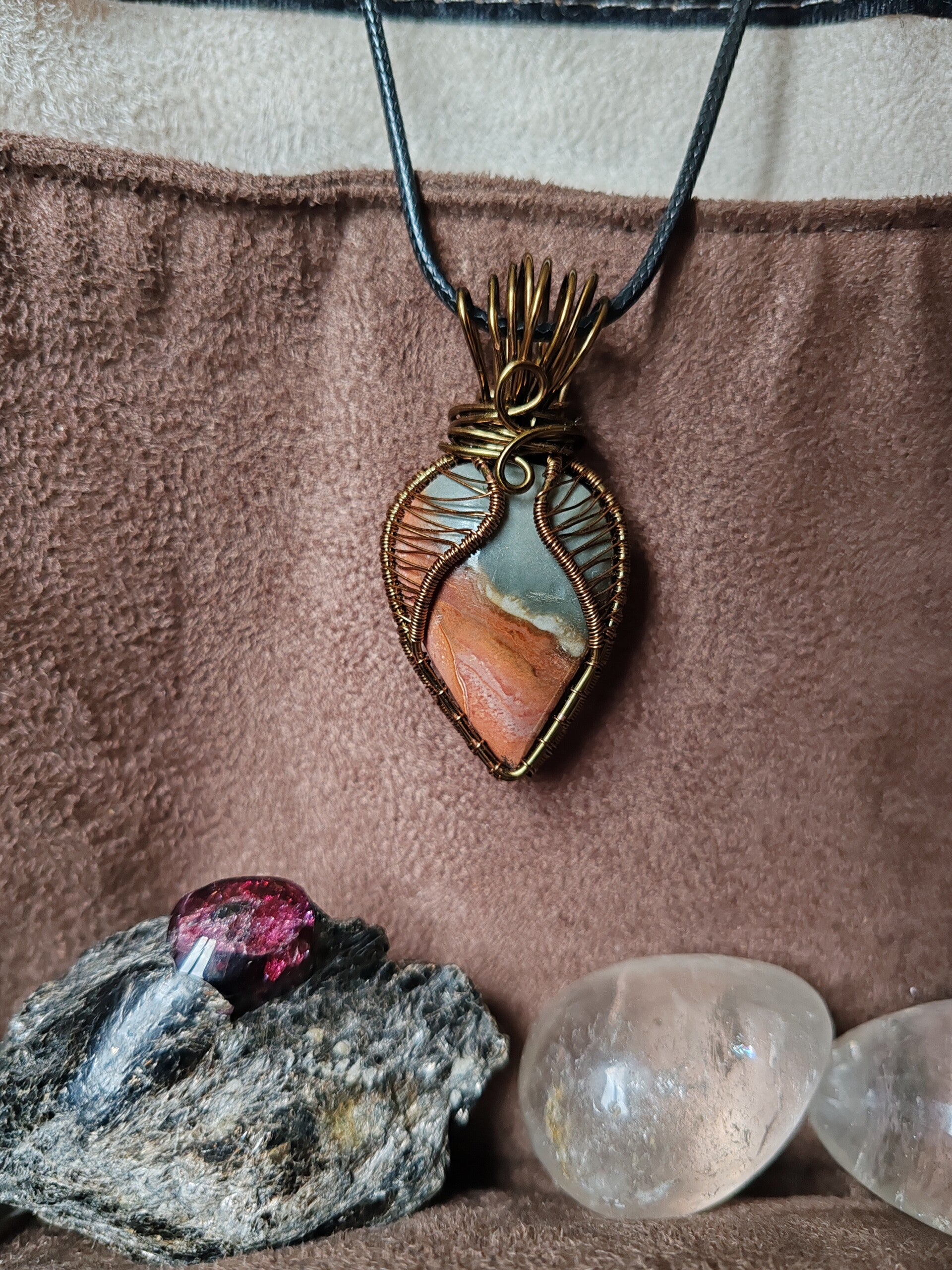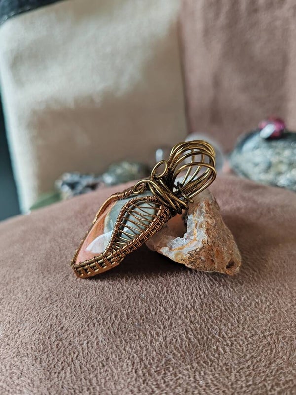 J'utilise du fil de cuivre, teinté ou non, traité antioxydant ou non, de laiton et d'aluminium. Avec le temps, ces matériaux s'oxydent, et patinent le bijoux. Certains aiment et d'autres pas, il est possible de les nettoyer avec de la laine d'acier 0000 et de l'eau savonneuse, afin de leur rendre leur brillance d'origine. Pour limiter l'oxydation, je vous recommande de ne pas prendre de douche avec votre bijoux, d'éviter de le mouiller.  Pour certaines pierres, les variations de températures sont déconseillées et risqueraient de les endommager à long terme.