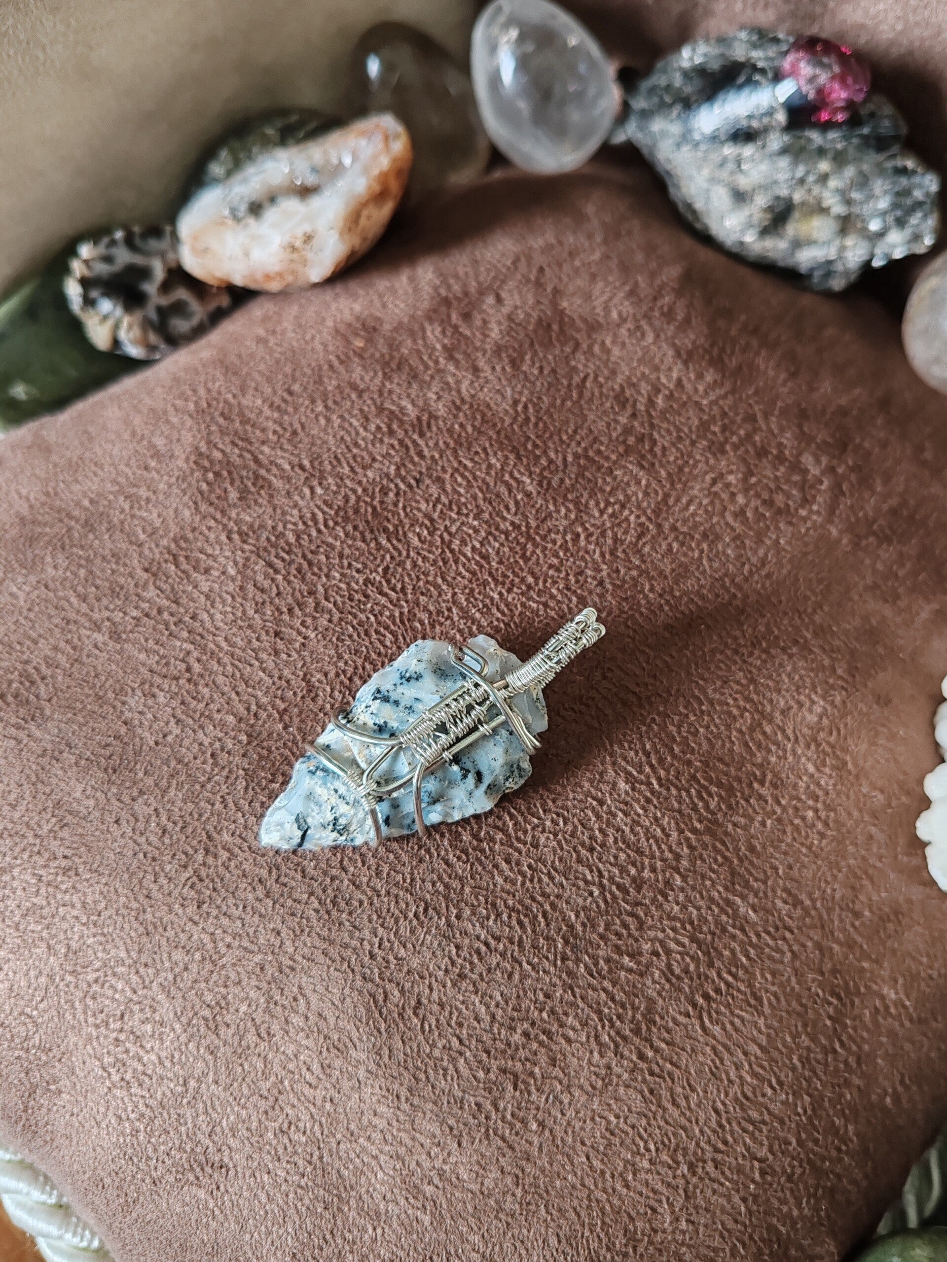 J'utilise du fil de cuivre, teinté ou non, traité antioxydant ou non, de laiton et d'aluminium. Avec le temps, ces matériaux s'oxydent, et patinent le bijoux. Certains aiment et d'autres pas, il est possible de les nettoyer avec de la laine d'acier 0000 et de l'eau savonneuse, afin de leur rendre leur brillance d'origine. Pour limiter l'oxydation, je vous recommande de ne pas prendre de douche avec votre bijoux, d'éviter de le mouiller. Pour certaines pierres, les variations de températures sont déconseillées et risqueraient de les endommager à long terme.