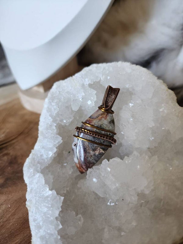 Ce pendentif a été réalisé en wire wrapping à l’aide de fil de cuivre couleur bronze vieilli, enroulé délicatement autour de la pierre pour souligner ses courbes naturelles. Chaque spirale, chaque boucle, chaque torsade est le fruit d’un geste précis — sans colle, sans soudure, uniquement du fil et de la patience.