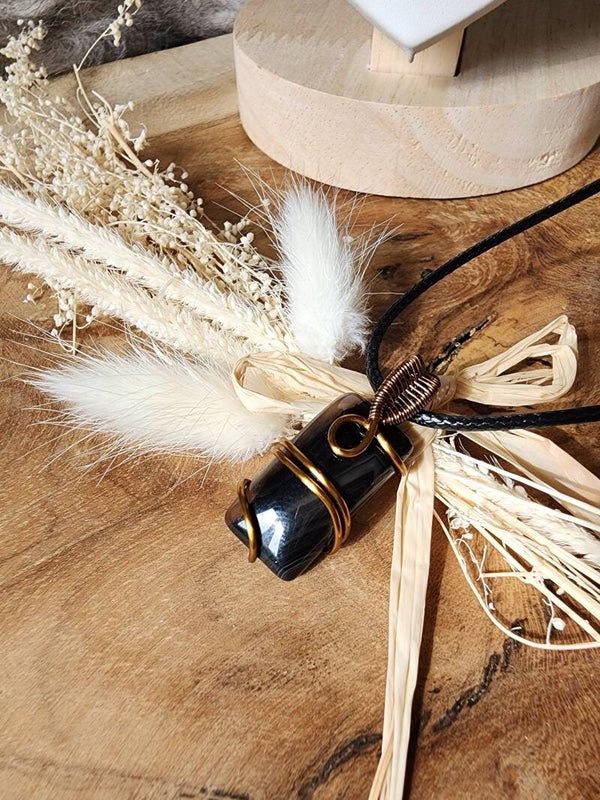 Mini pendentif minimaliste tissé à la main en fil de cuivre antique. Il laisse toute la place à la pierre, à ses rubans sombres, presque secrets. Rien de trop.