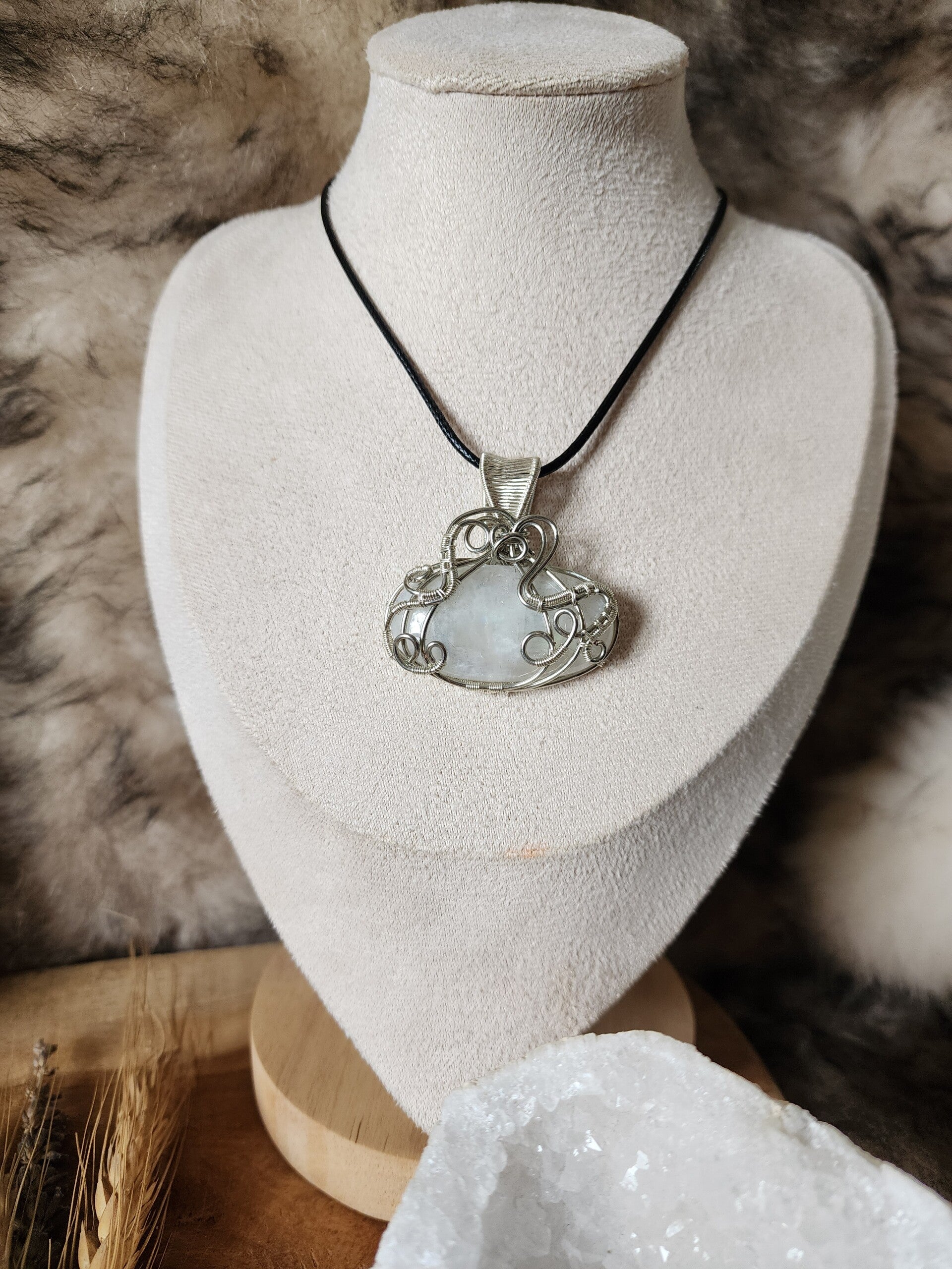 Façonné à la main avec du fil de cuivre argenté, ce pendentif au tissage raffiné met en valeur une péristérite sélectionnée pour sa clarté et ses reflets discrets.