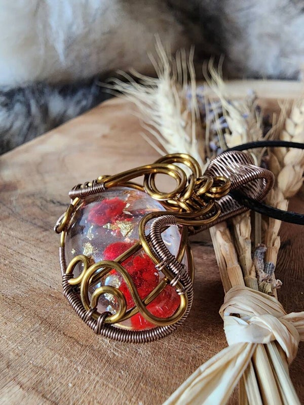 Un pendentif en forme de citrouille où la résine fleurie et dorée, imaginée en collaboration avec Miss E., capture la magie de l’automne. Chaque reflet semble danser à la lumière, comme un petit trésor suspendu entre ciel et terre.