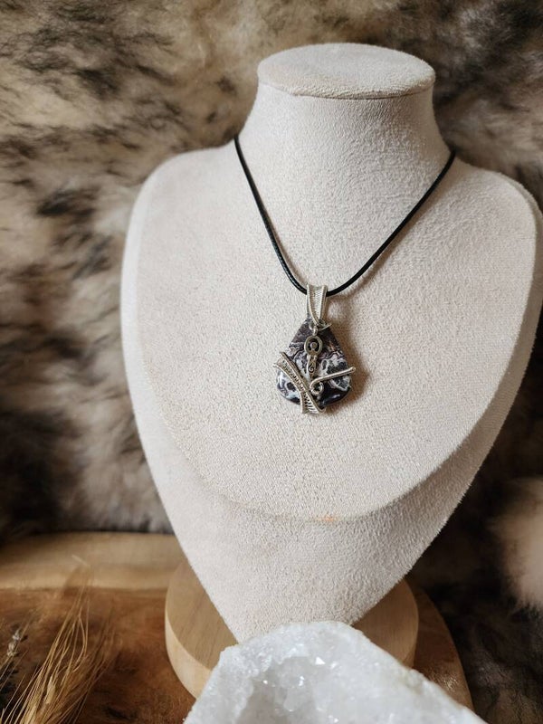 Chaque pendentif est travaillé à la main avec soin : le fil de cuivre argenté épouse la pierre et met en valeur ses arabesques naturelles, tandis que la breloque déesse apporte une touche symbolique et féminine.