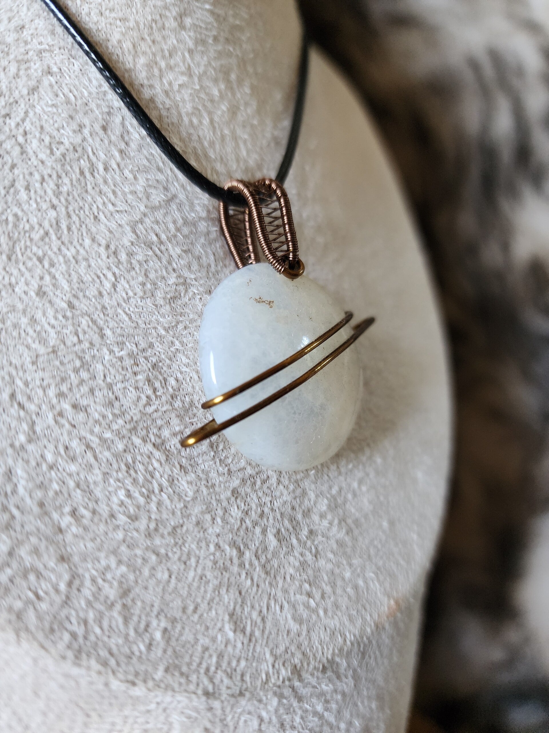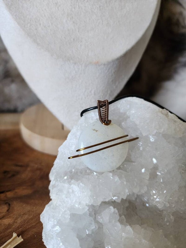 Tissé à la main en fil de cuivre antique, ce pendentif met en valeur la rondeur parfaite de la pierre et son éclat clair. Deux arcs métalliques viennent souligner son allure cosmique, tel un monde à part entière.