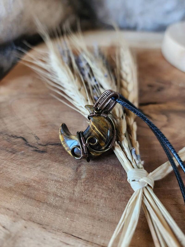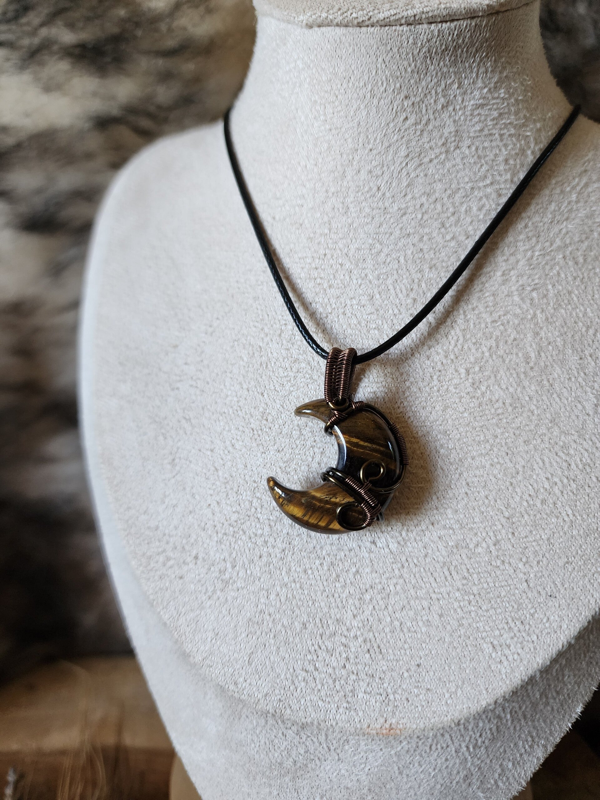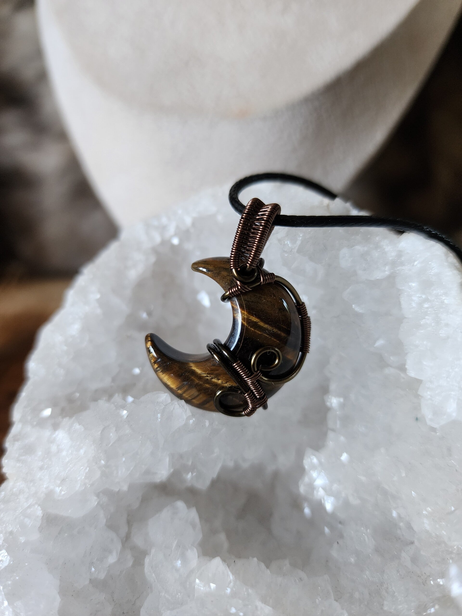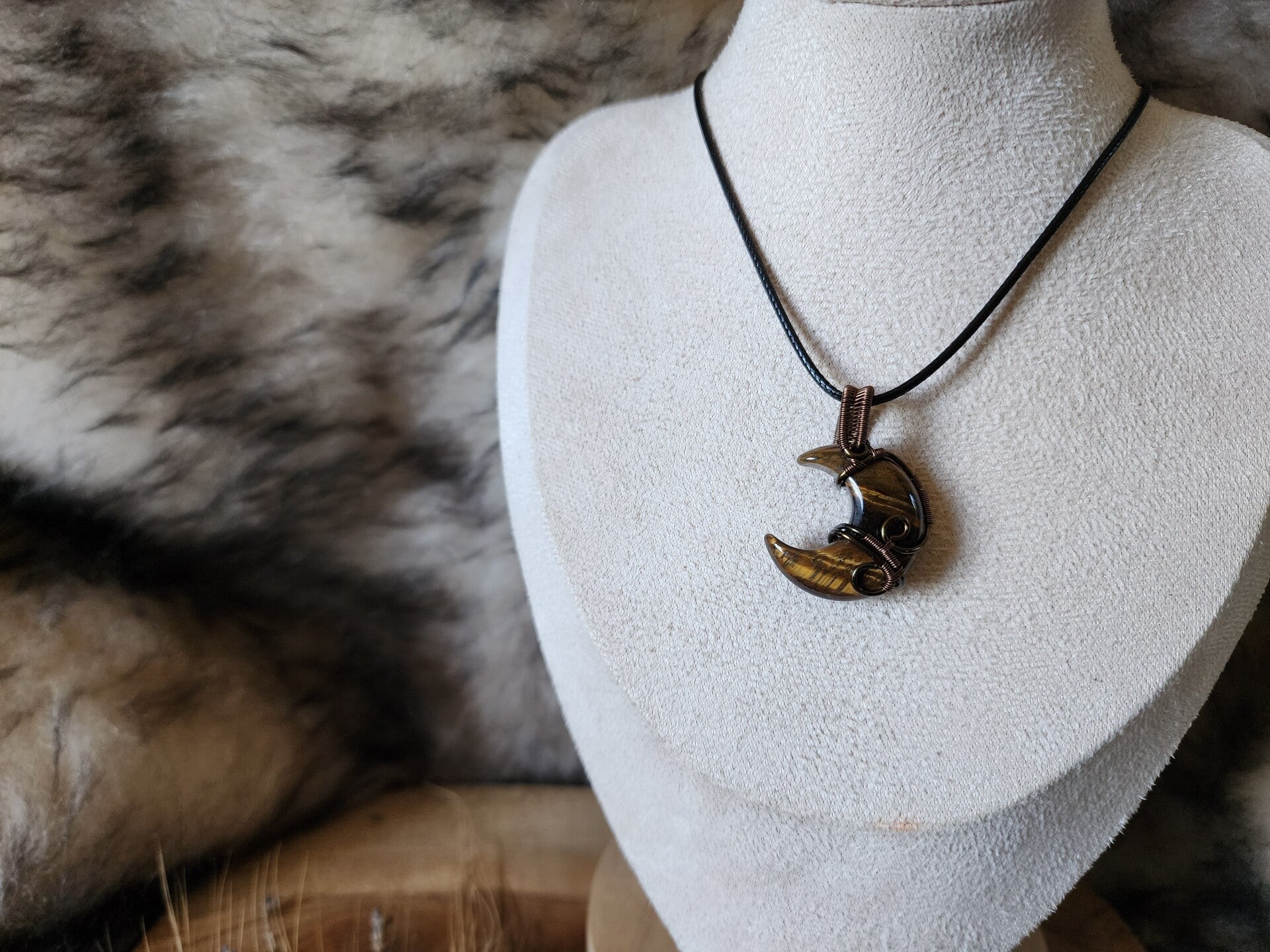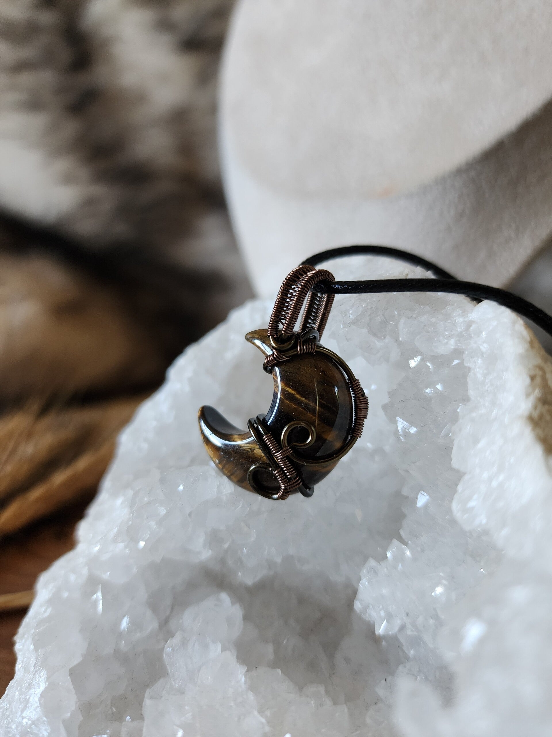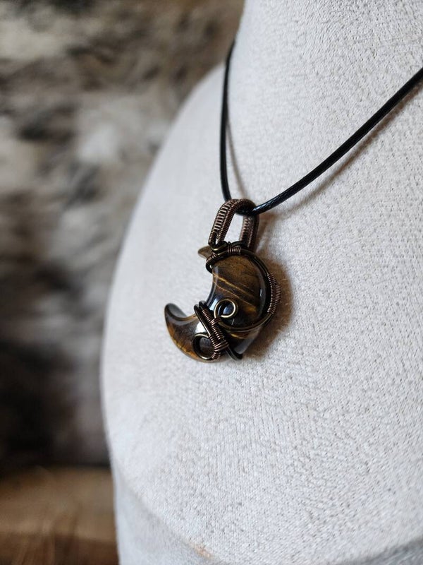 Le tissage en fil de cuivre antique épouse la pierre en forme de demi-lune, révélant ses reflets dorés et bruns chatoyants. Une pièce singulière qui mêle ombre et lumière.