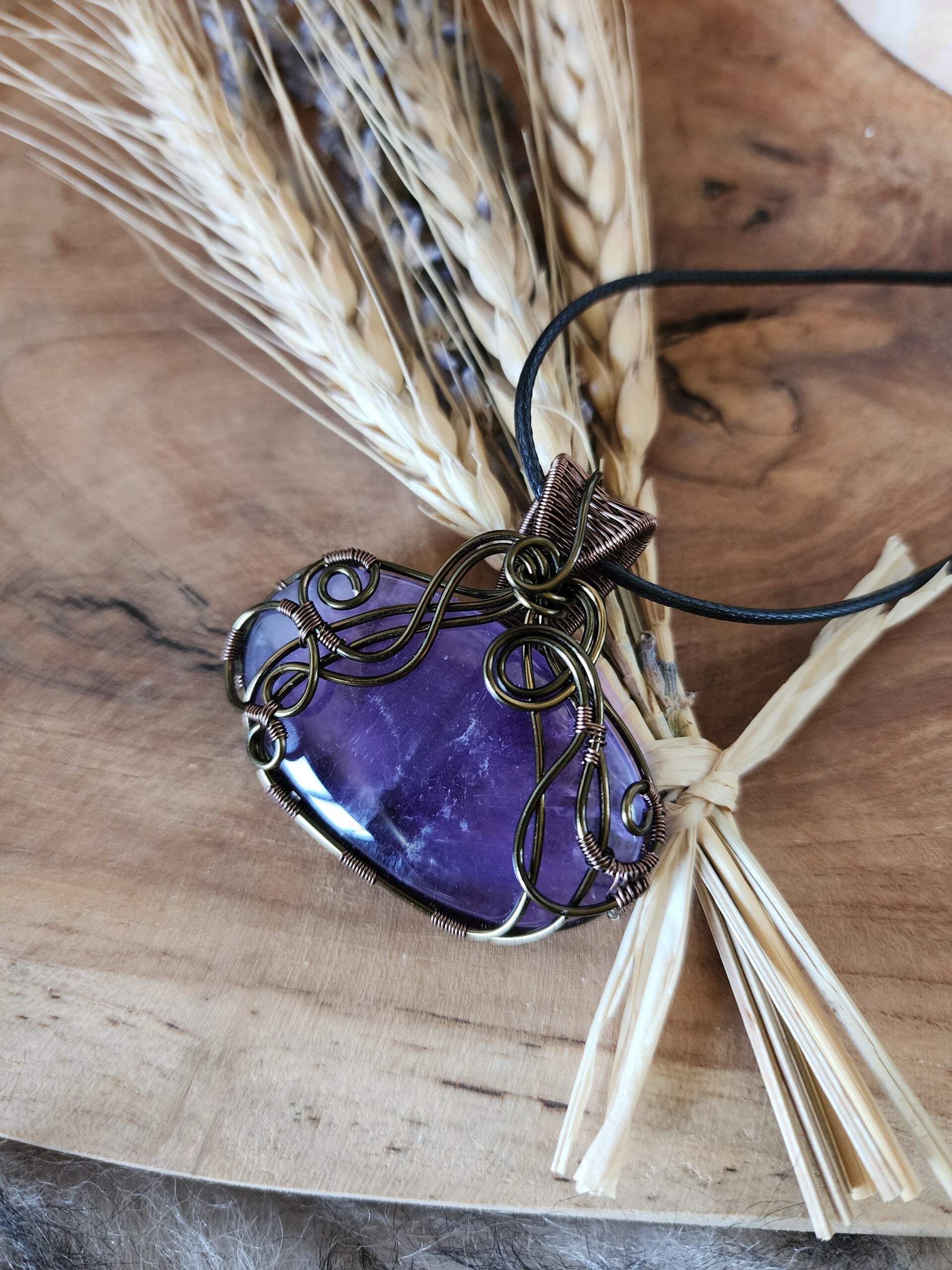 J'utilise du fil de cuivre, teinté ou non, traité antioxydant ou non, de laiton et d'aluminium. Avec le temps, ces matériaux s'oxydent, et patinent le bijoux. Certains aiment et d'autres pas, il est possible de les nettoyer avec de la laine d'acier 0000 et de l'eau savonneuse, afin de leur rendre leur brillance d'origine. Pour limiter l'oxydation, je vous recommande de ne pas prendre de douche avec votre bijoux, d'éviter de le mouiller. Pour certaines pierres, les variations de températures sont déconseillées et risqueraient de les endommager à long terme.
