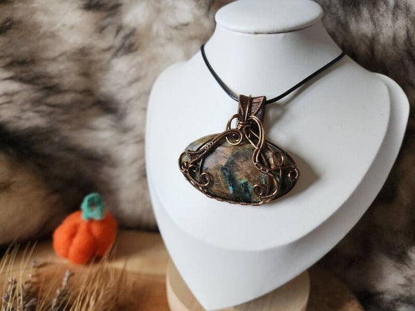 Chaque fil de cuivre a été patiemment tissé autour de cette grande pierre aux reflets hypnotiques. Les volutes du tissage rappellent les lignes d’une citrouille magique façonnée par le temps.