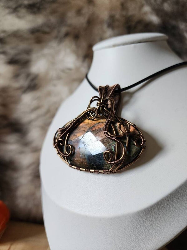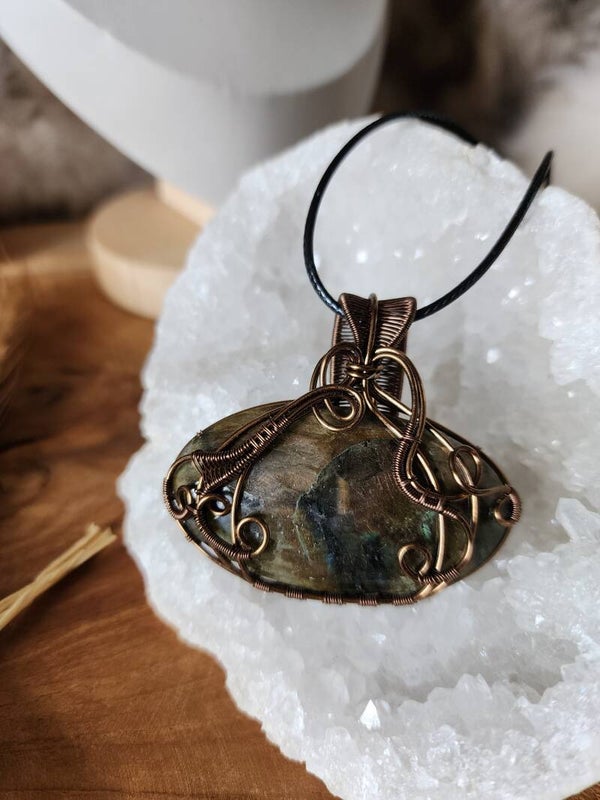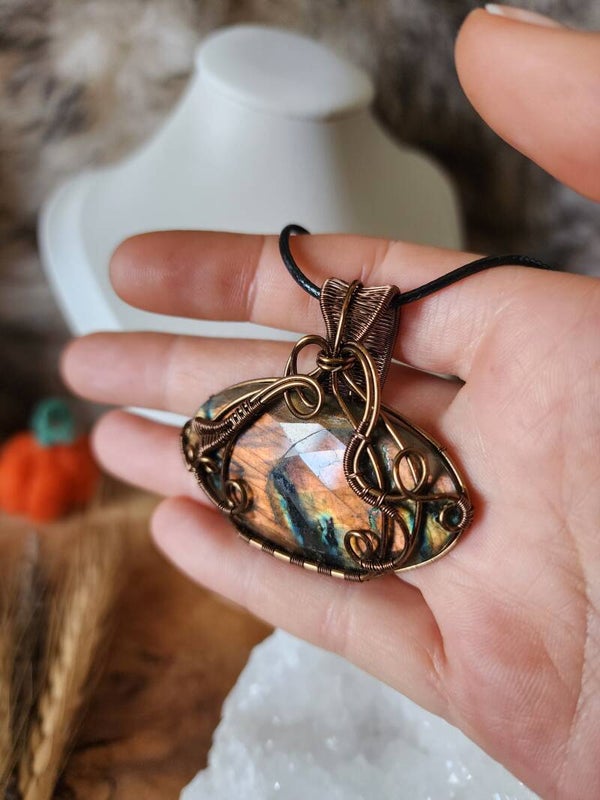 Sous son allure de citrouille mystique, Fakt semble tout droit sorti d’un conte oublié. Une labradorite aux reflets changeants s’y déploie comme un ciel en mouvement, tissée dans un cuivre antique qui souligne chaque courbe avec un charme presque alchimique.