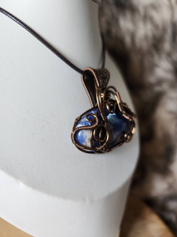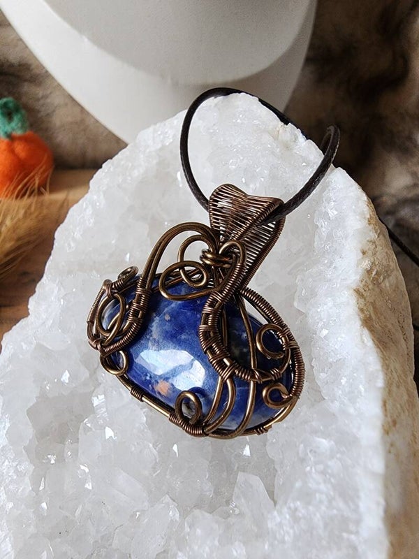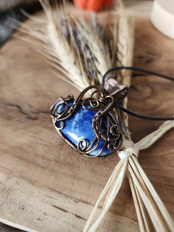 Chaque fil de cuivre a été tissé à la main pour épouser la forme ronde de cette petite citrouille céleste. Le contraste entre le bleu profond de la sodalite et la chaleur du cuivre antique lui donne un charme d’autrefois.