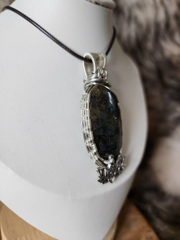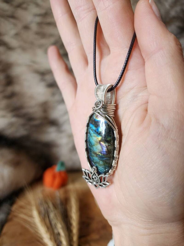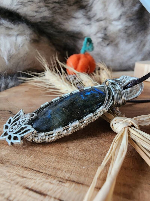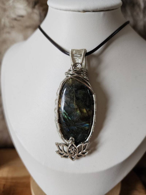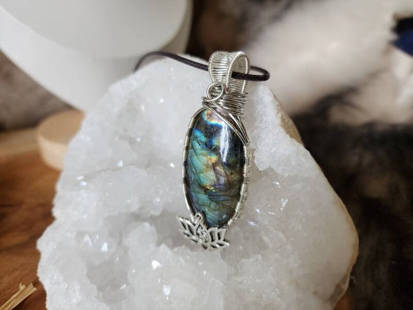 Une lueur boréale semble s’être posée sur Fekda, pendentif élancé où la labradorite déploie ses reflets mystérieux. Sa silhouette fine s’achève sur une petite fleur de lotus, symbole d’éveil et d’équilibre, comme une étoile qui aurait choisi de s’ancrer à la terre.