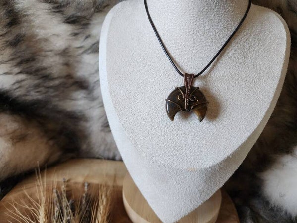 Chaque fil de cuivre antique a été minutieusement tissé autour de la pierre, sculptée en lune. Ses reflets dorés se marient parfaitement à la teinte cuivrée du fil, créant un pendentif à la fois solaire et mystique.