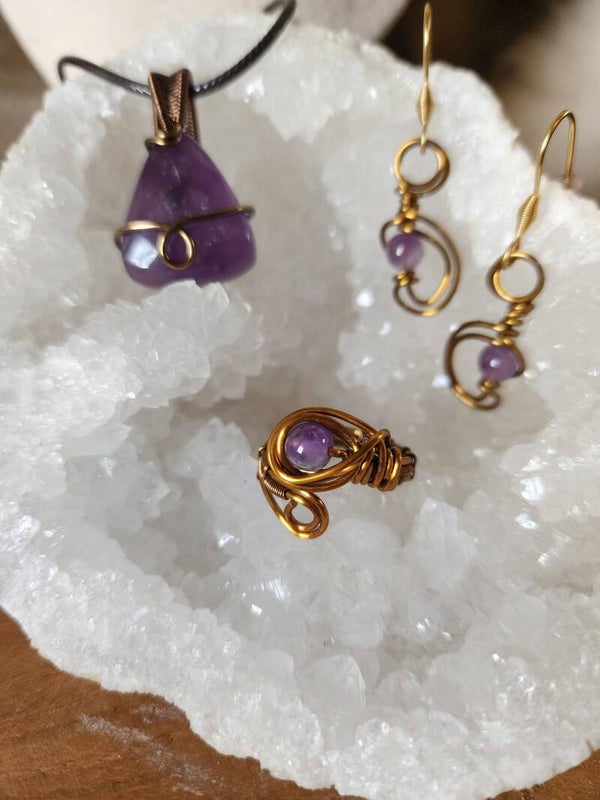 Une parure au charme ancien, où le cuivre antique enlace les reflets violets de l’Améthyste.
