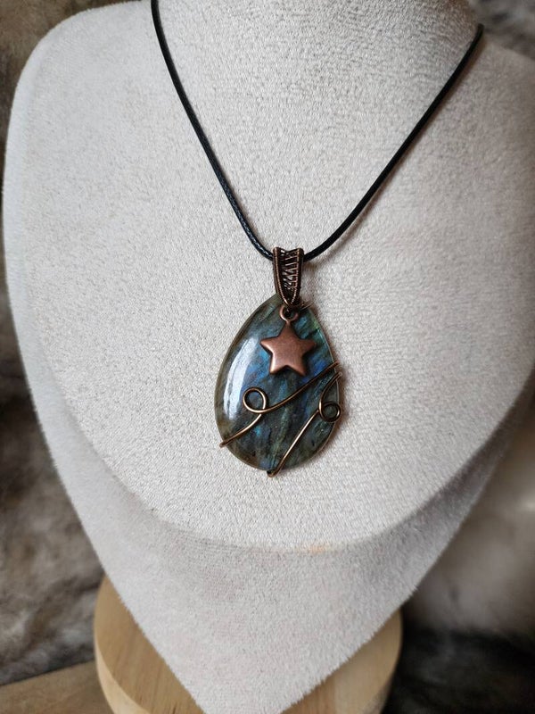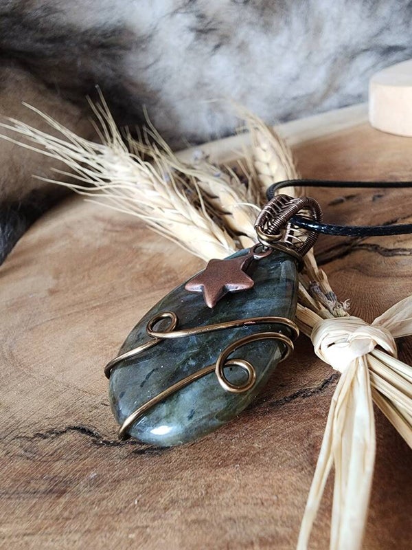 Un éclat venu d’ailleurs… La labradorite de Gallina capte la lumière comme une aile en plein vol — un reflet changeant, presque vivant. Entre ses filets de cuivre antique se glisse une étoile, comme un clin d’œil au ciel pour celles qui aiment rêver les yeux ouverts.