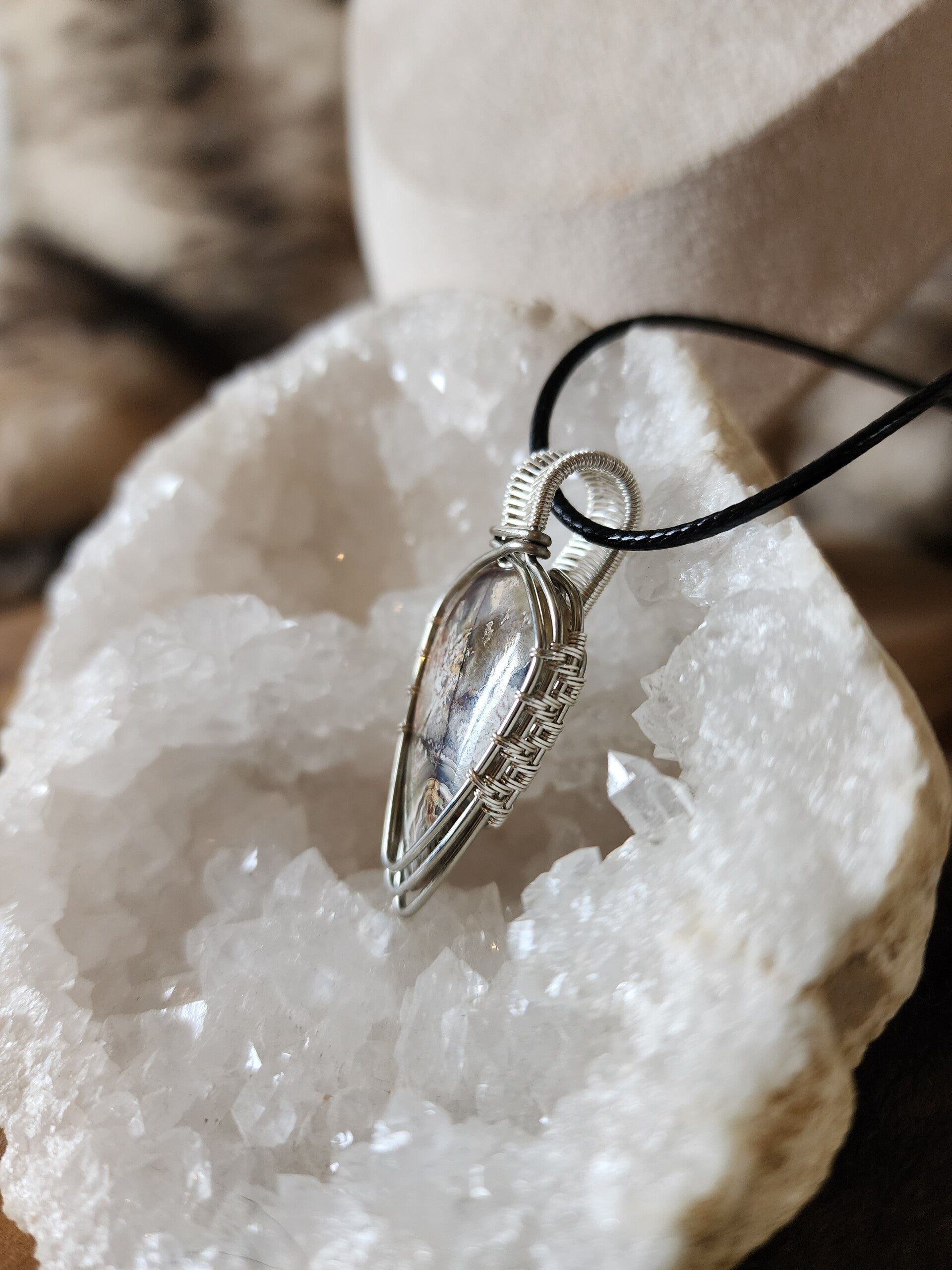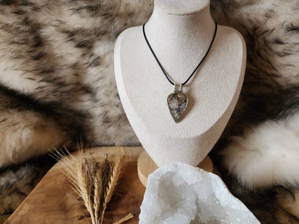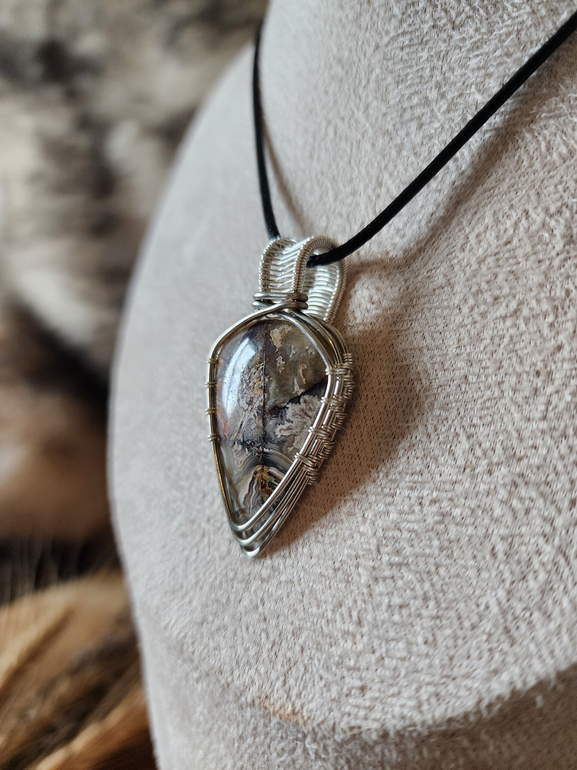 Tissée à la main en cuivre argenté, chaque courbe de fil épouse le mouvement naturel de la pierre, comme une onde lumineuse. Ses nuances chaudes et ses motifs fous en font un bijou vibrant, impossible à reproduire.