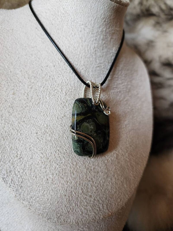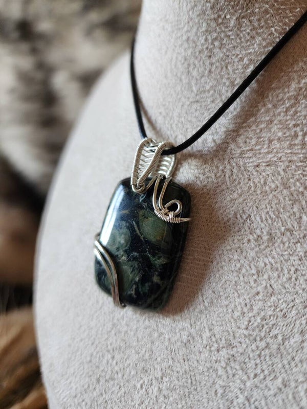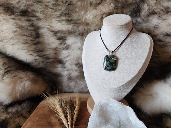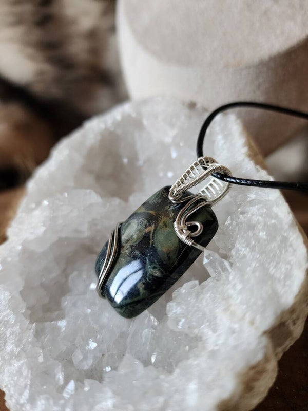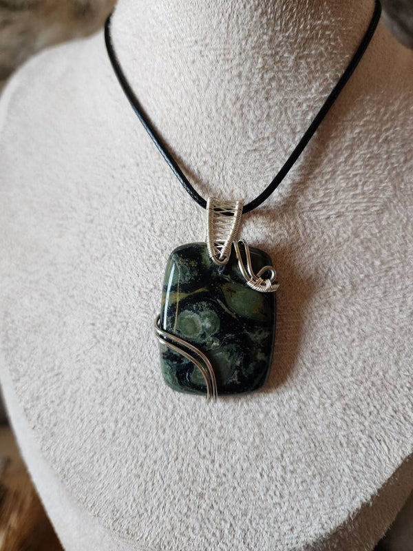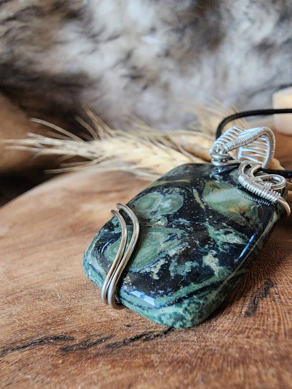 Le Jaspe Kambaba, avec ses spirales sombres et ses motifs presque fossiles, dégage une puissance calme et ancienne. Sertie dans son tissage argenté, la pierre devient une présence forte, protectrice, presque totemique.
