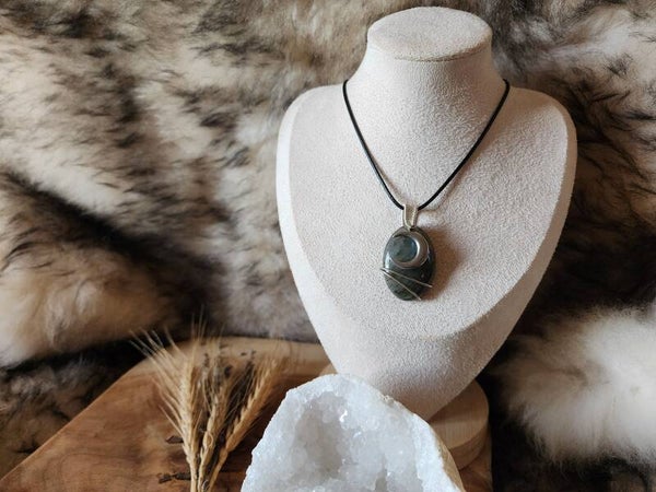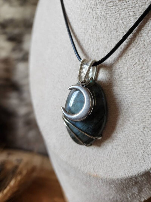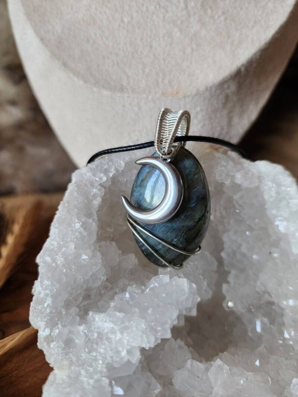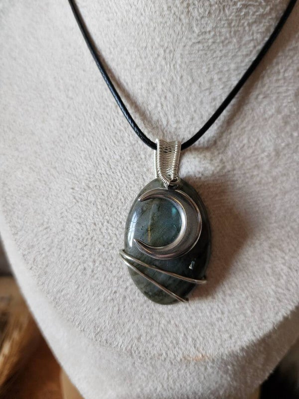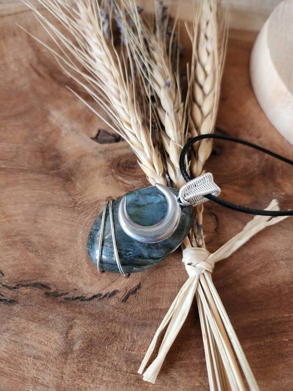 La labradorite, avec ses éclats changeants, capte la lumière comme une aile irisée. Sertie dans son tissage argenté et accompagnée d’une petite lune, elle devient un fragment céleste, une étoile nomade à garder près du cœur.
