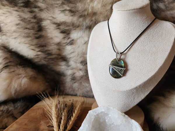 La labradorite capte la lumière et la transforme en reflets bleutés, verts ou dorés, comme si une étoile se réveillait sous la surface. Portée par son tissage argenté, elle devient un talisman élégant, mystérieux, presque cosmique.