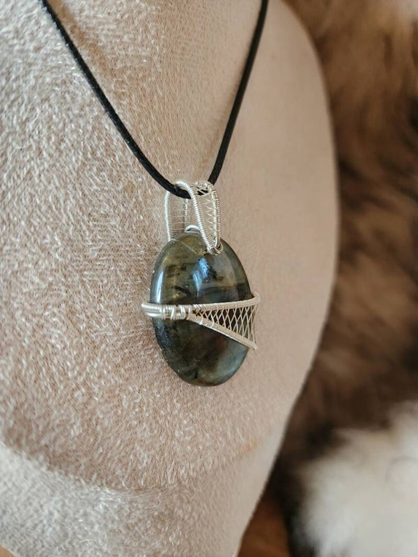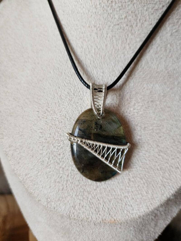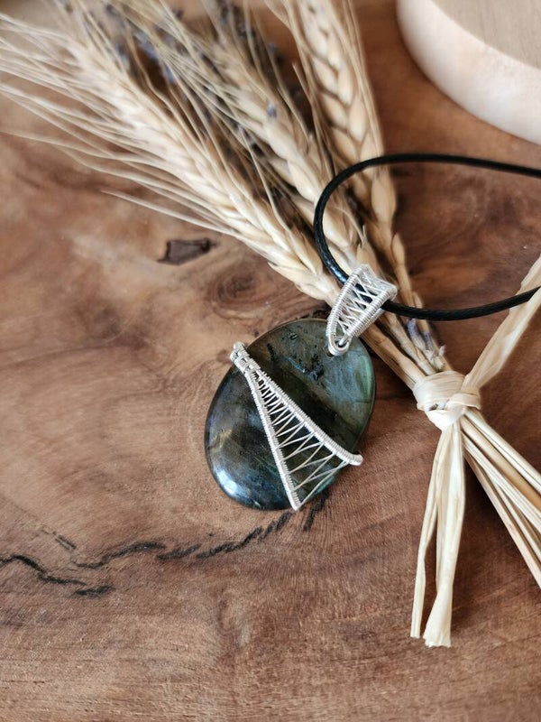 Le fil de cuivre argenté enveloppe la pierre en soulignant ses éclats naturels. Chaque courbe du tissage met en valeur ses reflets changeants, pour un pendentif tout en présence et en finesse.