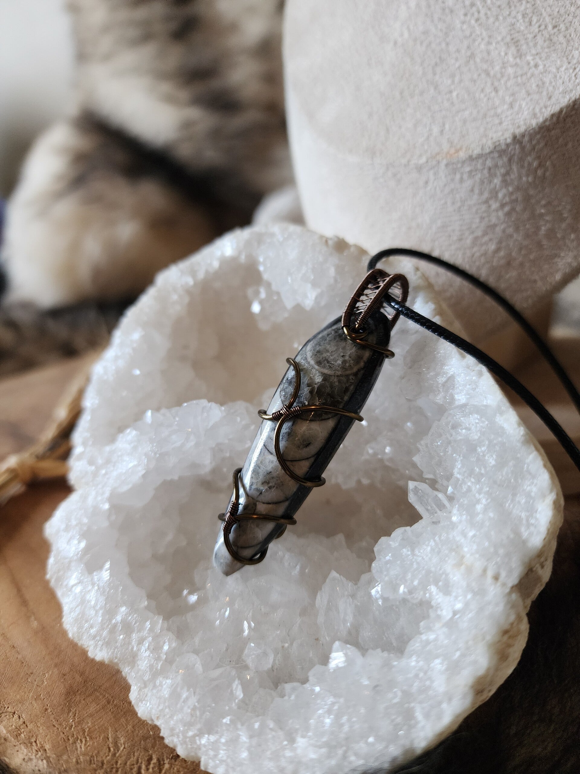 Ce pendentif est façonné à la main en fil de cuivre antique, soulignant le caractère brut et fossile de la pierre. Le tissage met en valeur ses lignes naturelles et son contraste profond.
