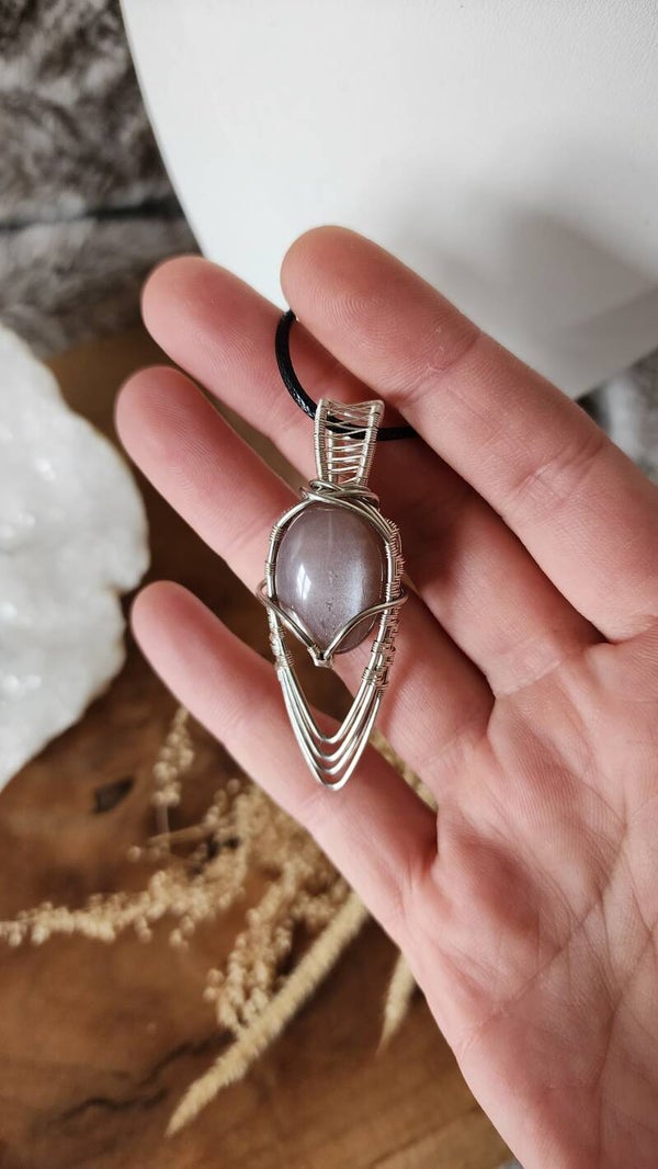 Ce pendentif est façonné à la main selon le modèle Féerik, tissé en fil de cuivre argenté autour d’une pierre de lune brune sélectionnée pour son caractère et sa présence. Chaque pièce est unique, guidée par la pierre elle-même.