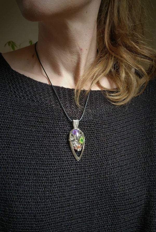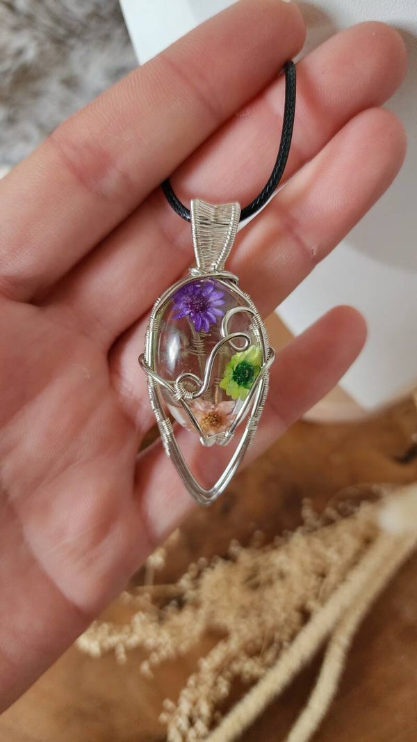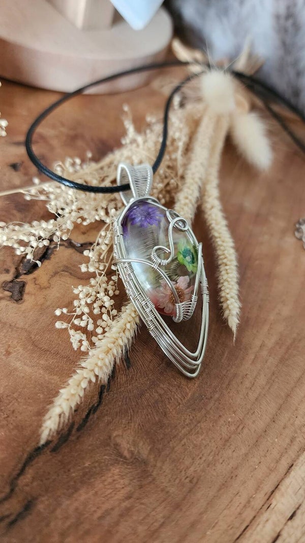Ce pendentif est façonné à la main selon le modèle Féerik, en fil de cuivre argenté. La résine fleurie est issue d’une collaboration avec Miss E.. Chaque pièce est unique, tant par la fleur que par son placement et son dialogue avec le tissage.