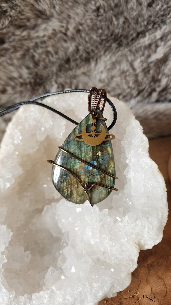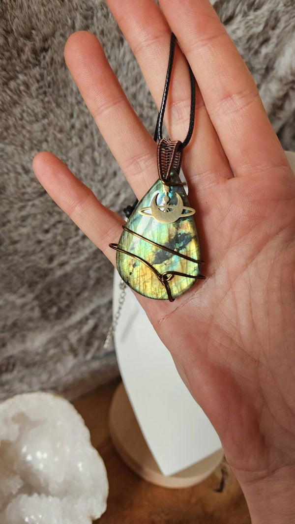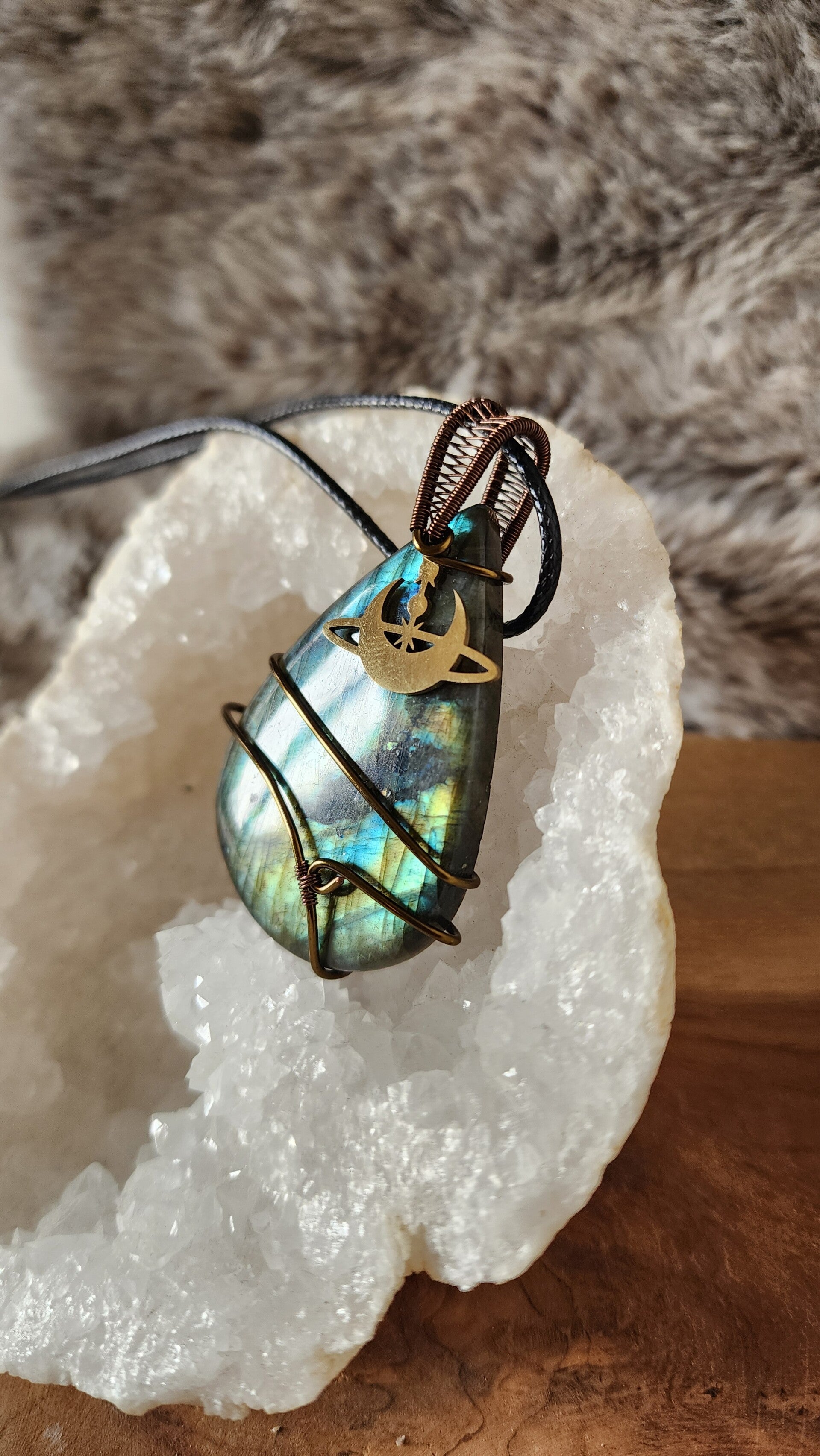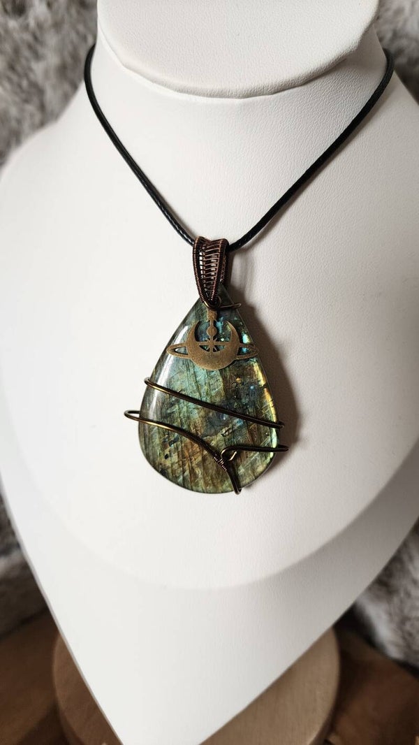 Chaque courbe du fil de cuivre antique a été façonnée à la main pour épouser la pierre et révéler sa présence. Le tissage entoure la labradorite avec finesse, tandis qu’une délicate breloque lune dorée vient compléter l’ensemble, apportant une touche céleste à la composition.