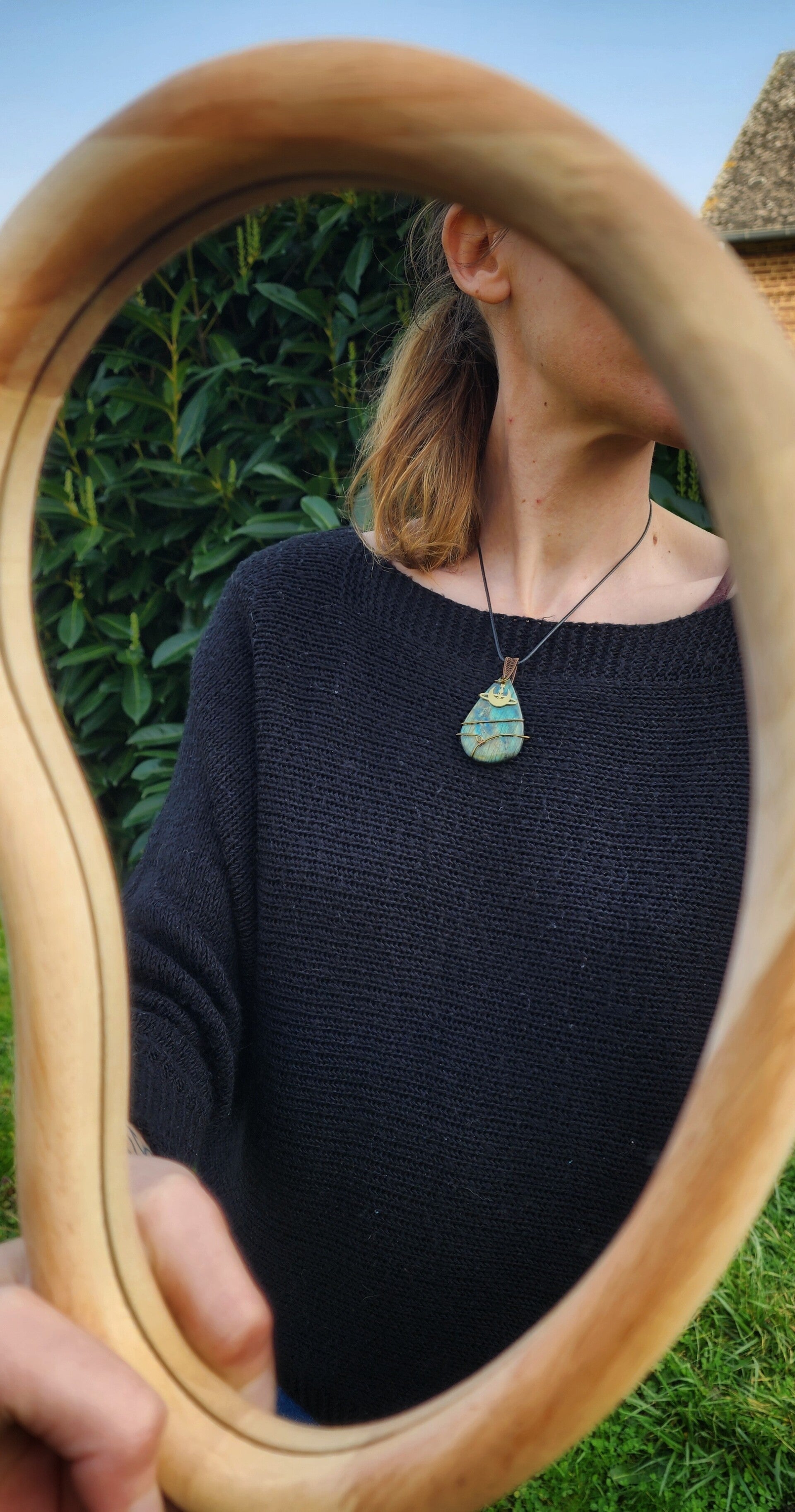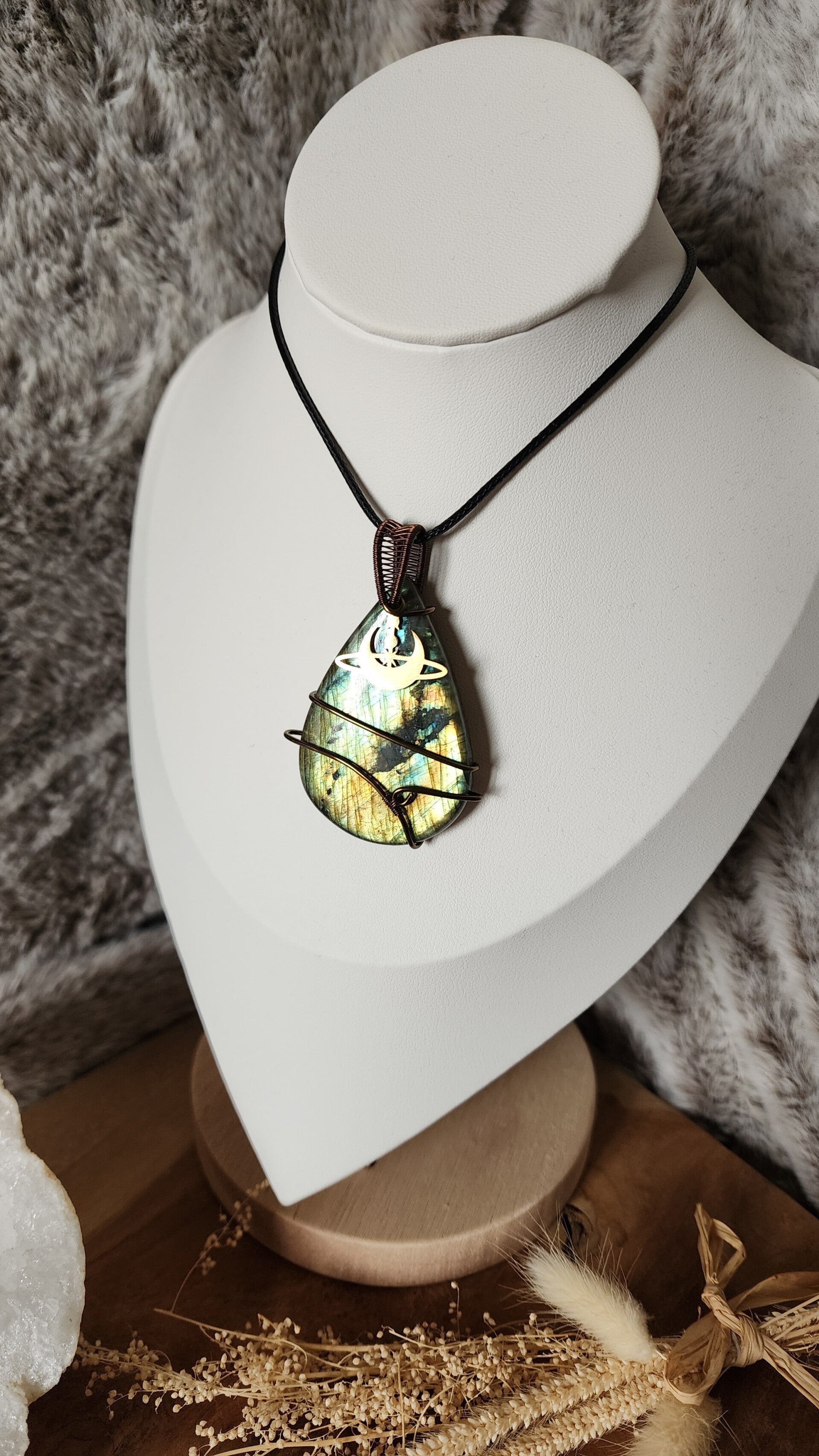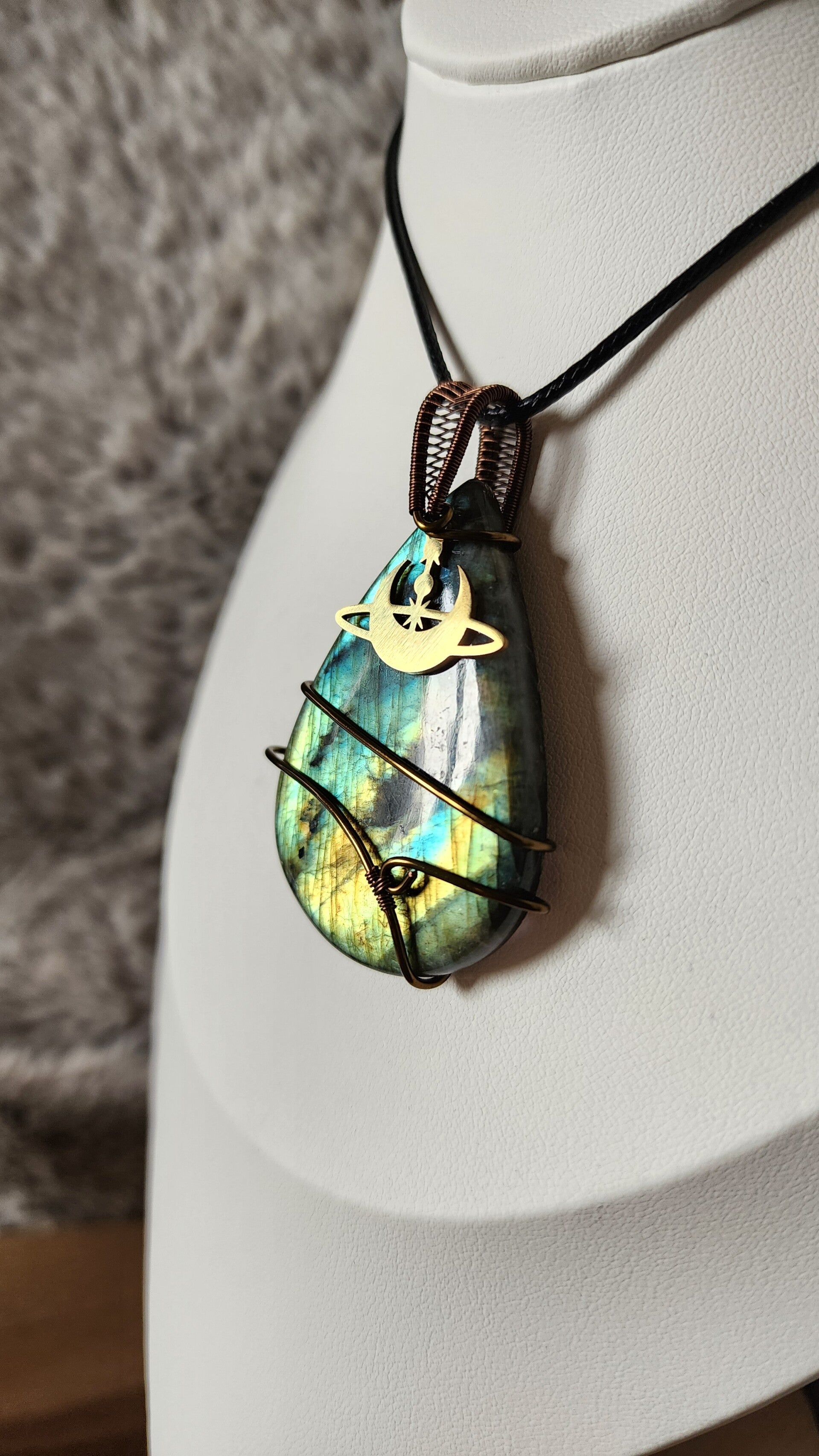 Chaque courbe du fil de cuivre antique a été façonnée à la main pour épouser la pierre et révéler sa présence. Le tissage entoure la labradorite avec finesse, tandis qu’une délicate breloque lune dorée vient compléter l’ensemble, apportant une touche céleste à la composition.