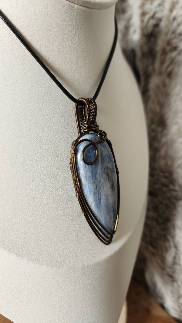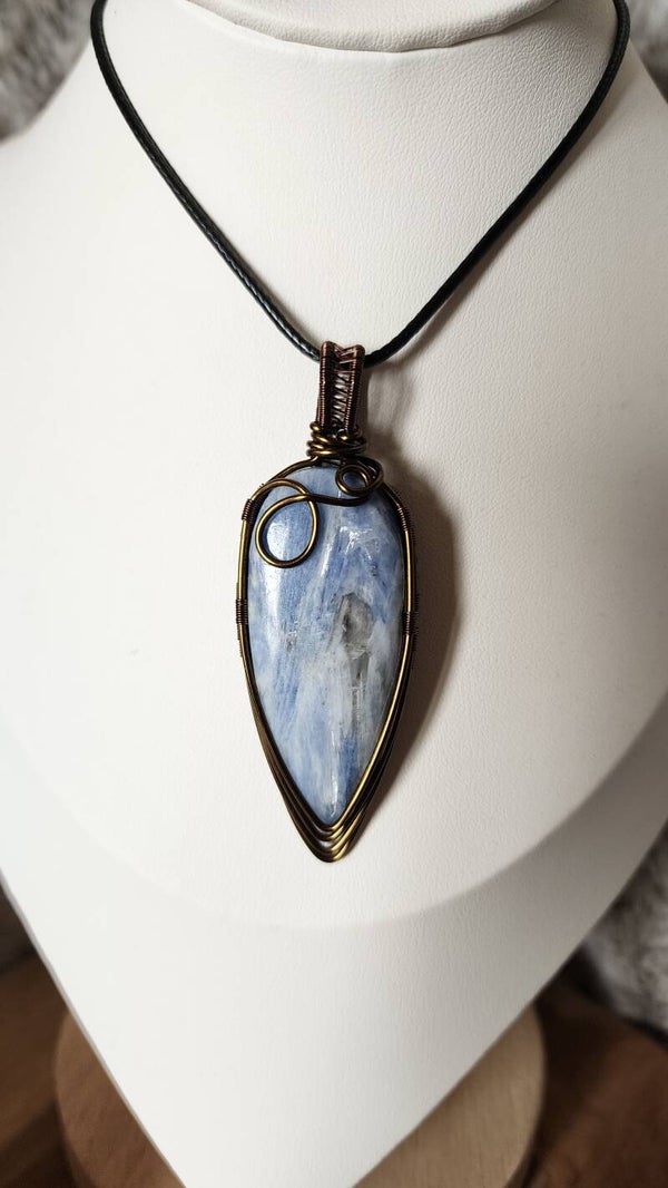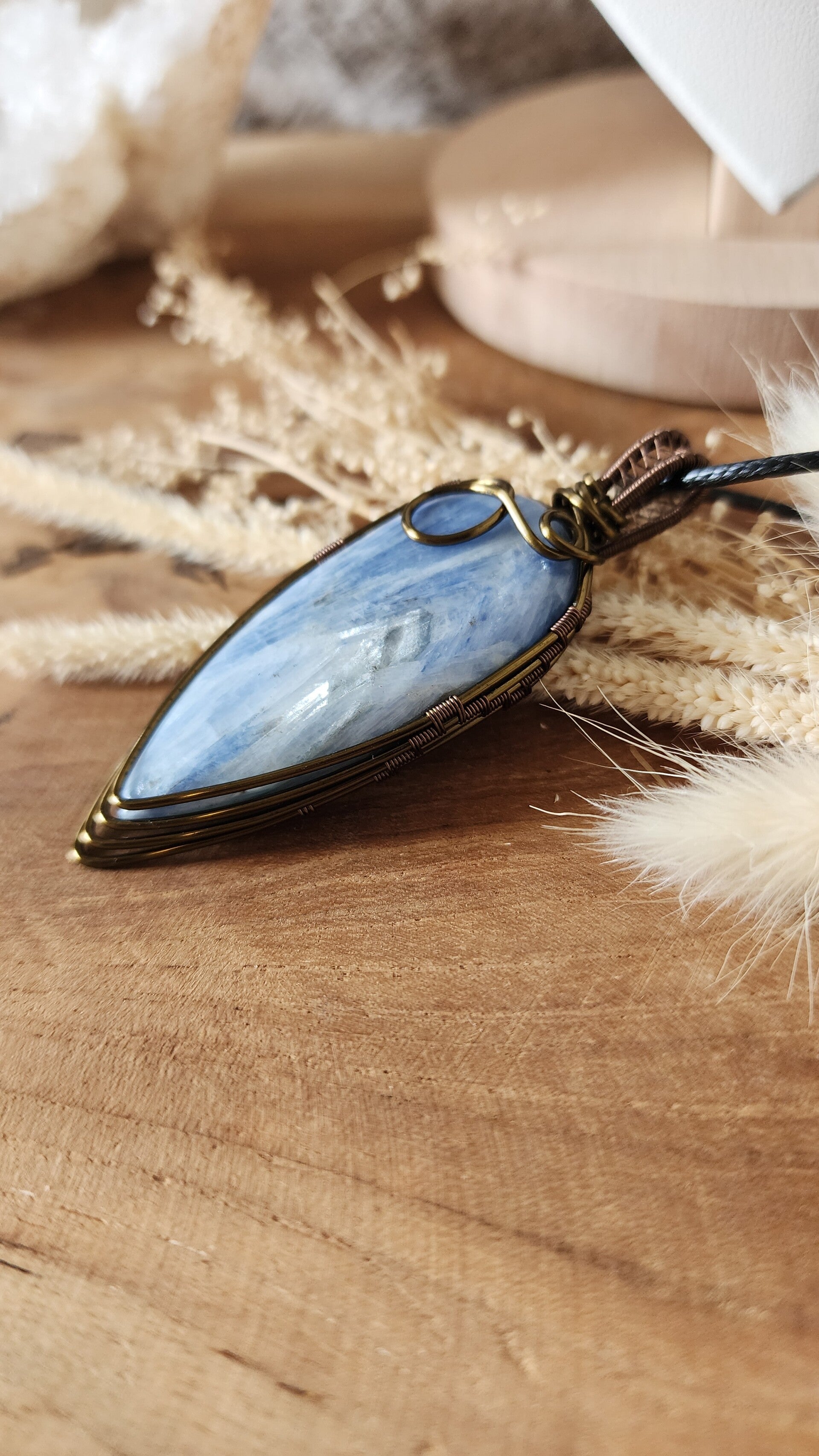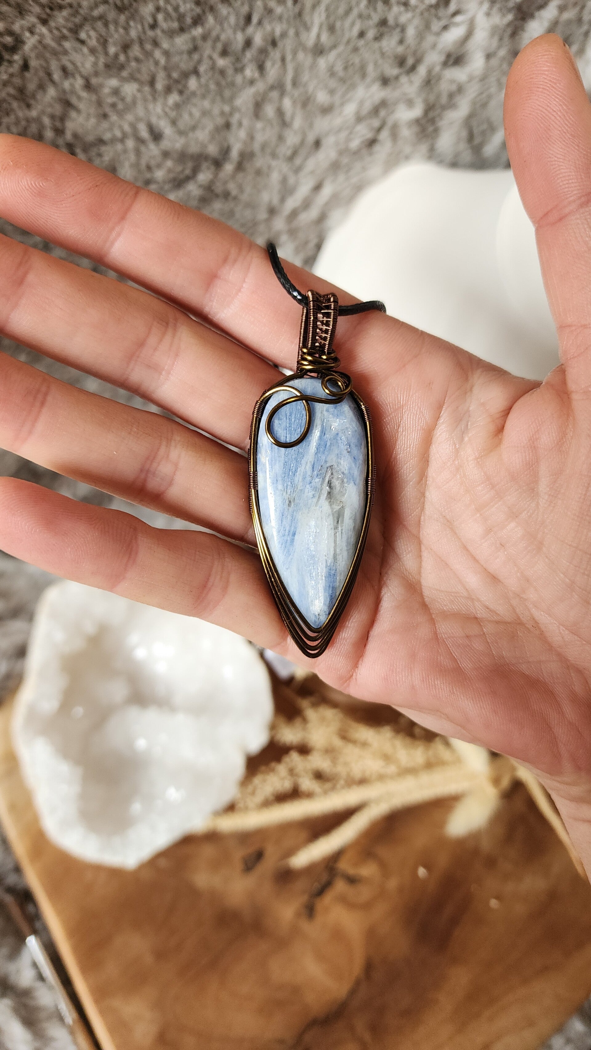 Chaque courbe du fil de cuivre antique a été façonnée à la main pour épouser la pierre et lui offrir un écrin délicat. Le tissage souligne la finesse naturelle de la cyanite et transforme cette pierre en talisman élégant.